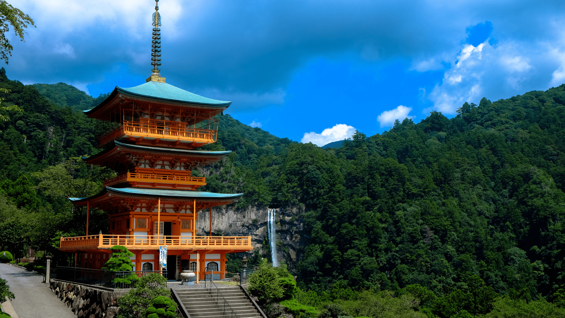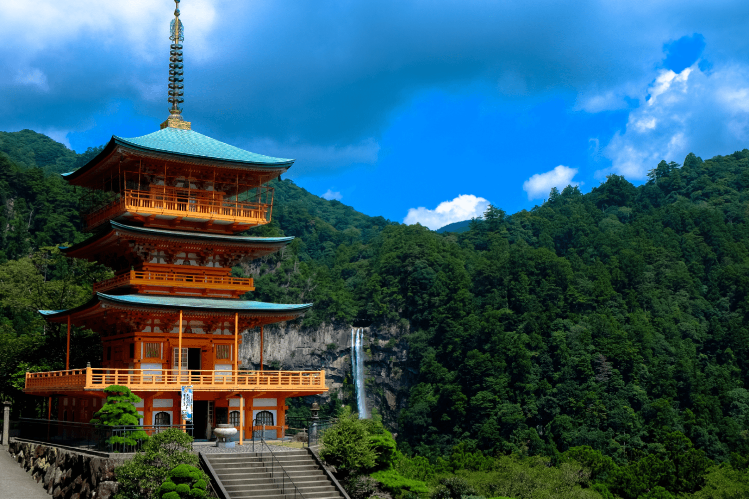 【Kumano Nachi Taisha(The pagoda of Seigantoji and nachi no Taki waterfall)】The shrine is part of a large complex of neighboring religious sites that exemplify the